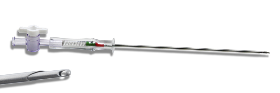 La aguja de acero inoxidable está unida en su extremo proximal a un mango de plástico con forma cómoda para la mano, que contiene una llave de paso y un conector de seguridad. Las agujas son de un solo uso.